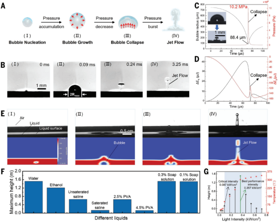 同時,該研究成果還在理論上取得三項重要突破:建立了光控空化的定量預測模型,可準確預測不同材料與液體環境中的空化閾值和能量輸出;提出空化能量調控理論,通過激光強度、光斑位置和照射時間等參數的精確調控,實現微牛至毫牛量級的力輸出和運動方向控制;發展多物理場耦合數值方法,將光熱效應、相變過程、流體動力學和固體力學統一于同一框架,完成全過程的高精度模擬。