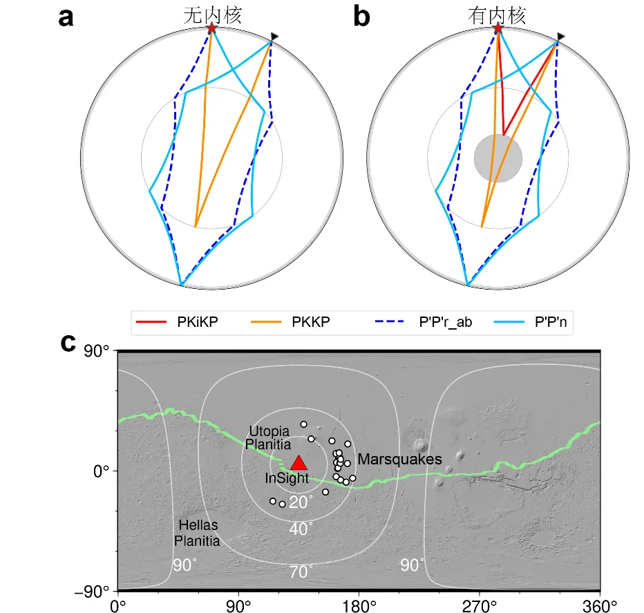 為突破這一挑戰,研究團隊創新性地引入火震陣列分析方法,通過對23個信噪比較高的火震事件數據的分析,成功提取出穿過火星核的關鍵震相,如在地表反射的PKPPKP(P'P')和在核幔邊界反射的PKKP(下圖a)。特別值得注意的是,實際觀測到的PKKP到時,較當前僅考慮液態核的火星速度模型所預測的結果提前了50至200秒。地震波在固體中的傳播速度比在液體中快。因此,這一差異表明,火星核具有分層結構:即外層為液態核,而更深部則存在一個波速更高的固態內核。