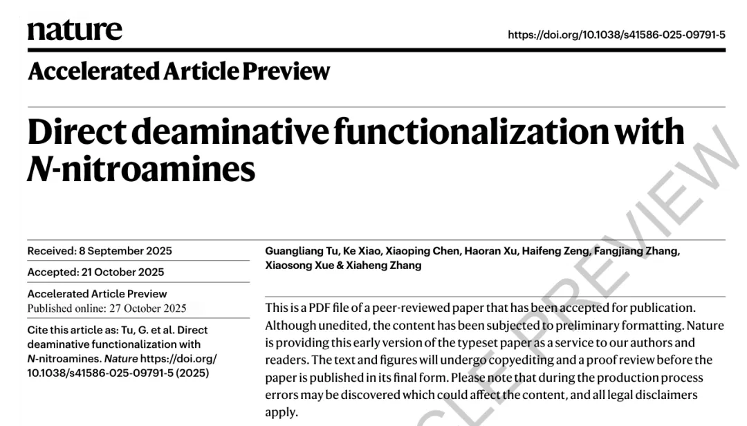 北京時間10月28日,國際權威期刊Nature發表了國科大杭州高等研究院(以下簡稱“杭高院”)化學與材料科學學院(以下簡稱“化材學院”)研究員張夏衡團隊最新成果——“Direct deaminative functionalization with N-nitroamines”。該成果受到Nature四位主審稿人的高度評價,作為審稿人之一的國際制藥巨頭輝瑞公司高級研發總監Scott Bagley給予評價:“true tour de force”(法語:真正的杰作)。