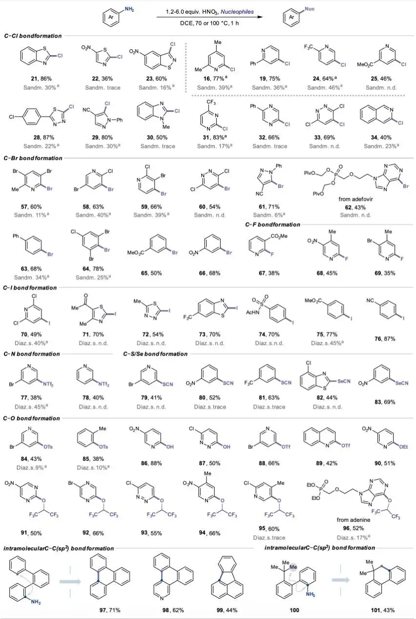 該研究利用芳香胺在硝酸介導下原位形成N-硝胺中間體,隨后通過脫除一氧化二氮(N?O),實現芳香C?N鍵向多種C?X鍵(包括C?Br, C?Cl, C?I, C?F, C?N, C?S, C?Se與C?O)以及C?C鍵的高效直接轉化。與經典的Sandmeyer反應條件相比,新方法在藥物合成中常用的多氮雜環體系里展現出顯著優勢;與其他脫氨官能化方法相比,此策略的核心優勢在于僅憑實驗室極易獲取的簡單試劑,就實現了出色的通用性:幾乎適用于所有類型的藥用雜芳胺及電性、結構各異的苯胺衍生物,不受氨基位置限制,并且能夠以簡易操作實現公斤級的規模化生產。