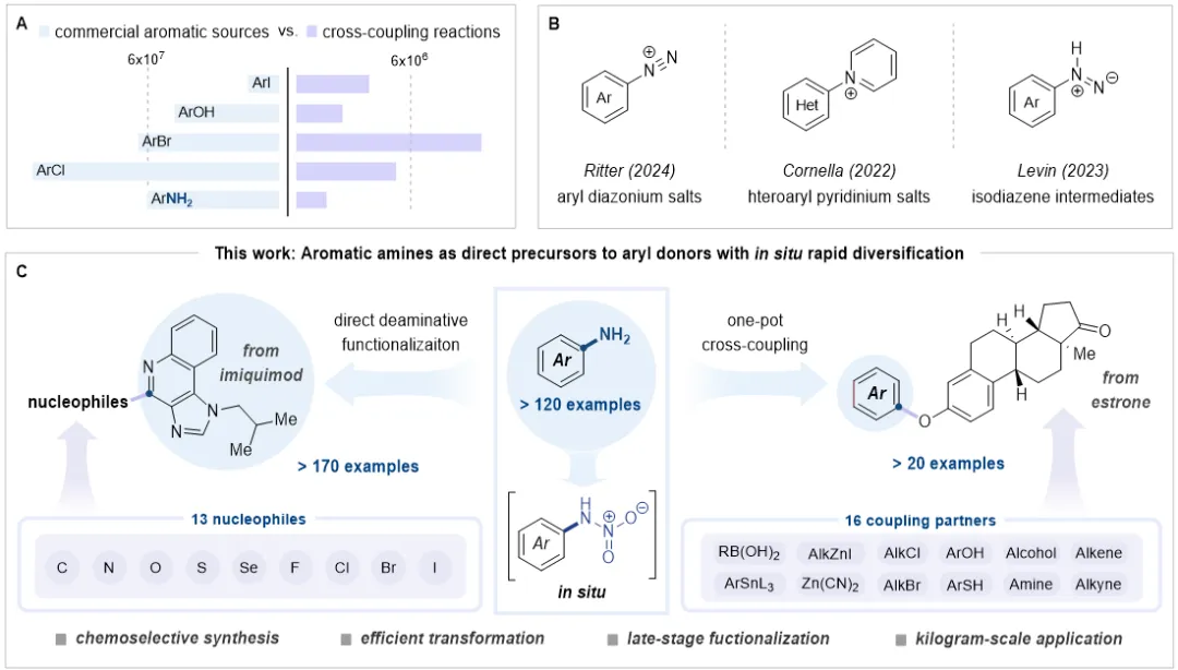 芳香胺作為生物活性分子里極為常見的官能團之一,廣泛存在于藥物、天然產物以及農藥等多種化合物結構之中。盡管其在分子構建中扮演著重要的結構基石角色,然而將其用作合成砌塊的研究進展卻相對滯后,尚未得到充分開發。在過去的一個多世紀里,工業領域通常先將芳香胺轉化為名為“重氮鹽”的中間體,進而利用重氮化合物的高反應活性開展后續轉化。該分步策略存在諸多弊端,如重氮鹽穩定性差、具有爆炸危險性,基于芳基重氮鹽的工藝還面臨化學計量級銅消耗大、底物兼容性受限等問題。