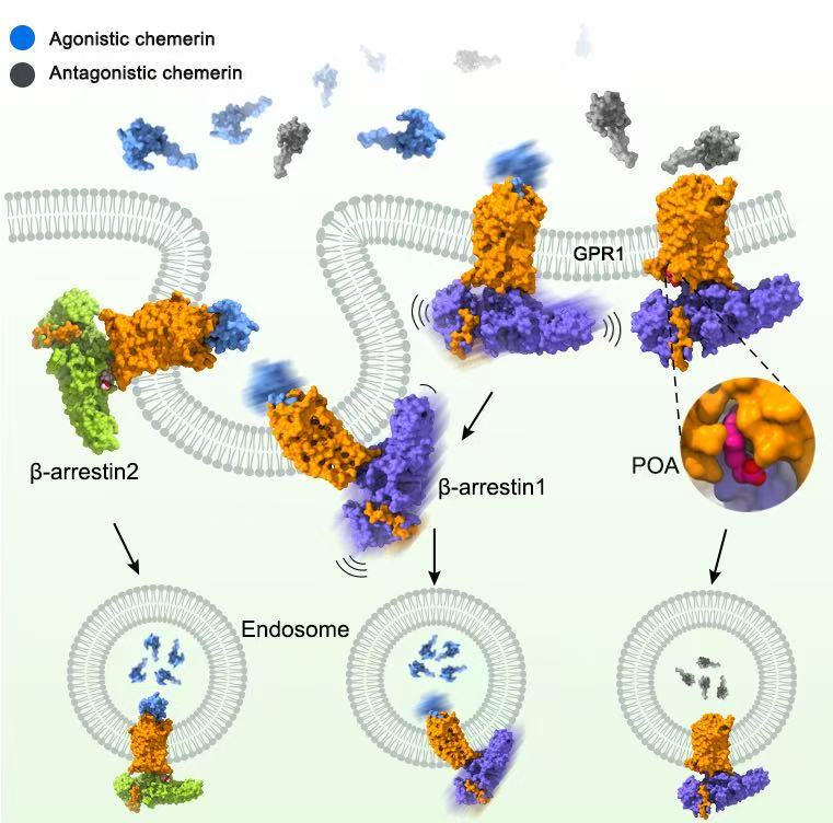 趨化素(chemerin)是一種重要的脂肪因子,參與調控脂質代謝和胰島素敏感性,與肥胖、糖尿病等代謝性疾病的發生發展密切相關。同時,趨化素還能介導免疫細胞定向遷移至炎癥部位,參與機體抵御病原入侵、維持穩態和修復組織損傷等重要生理過程,在炎癥與代謝之間發揮“橋梁”作用。趨化素的生物學效應由其受體介導,包括CMKLR1和GPR1。其中,CMKLR1作為一種典型的G蛋白偶聯受體(GPCR),通過G蛋白信號通路驅動脂質代謝與炎癥反應,而GPR1則是一種非典型的GPCR,依賴于阻遏蛋白介導的信號通路和受體內吞,清除過量的趨化素。趨化素及其受體通過這種“經典激活—非典型平衡”的雙重機制,在代謝平衡和炎癥反應調控中發揮關鍵作用,但相關分子機制一直未被明確闡明。