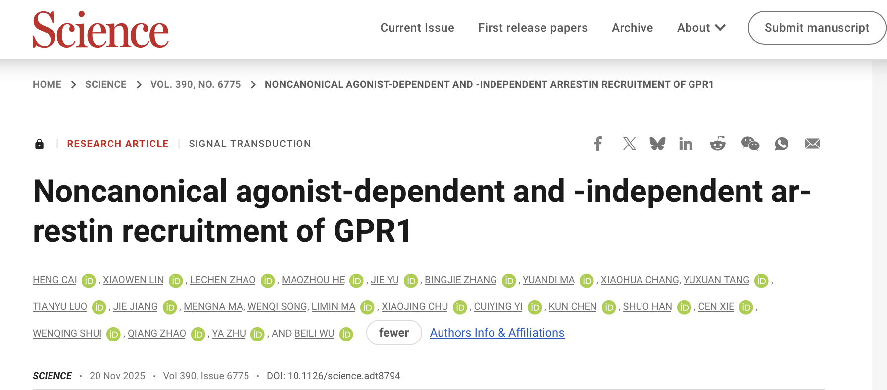 北京時間11月21日凌晨,國科大杭州高等研究院(以下簡稱“杭高院”)藥物科學與技術學院(以下簡稱“藥學院”)/中國科學院上海藥物研究所(以下簡稱“上海藥物所”)吳蓓麗課題組聯合臨港實驗室朱亞課題組、上海藥物所趙強課題組、上海科技大學水雯菁課題組和上海藥物所謝岑課題組最新成果——“Noncanonical agonist-dependent and -independent arrestin recruitment of GPR1”在國際頂級學術期刊Science正式發表。
