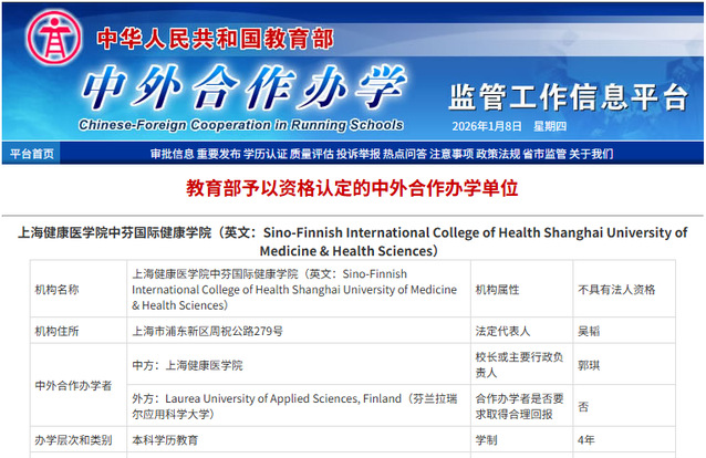 近日,上海健康醫學院中芬國際健康學院正式獲教育部批準設立。首批開設康復物理治療、數據科學與大數據技術兩個專業,開展本科層次學歷教育,學制4年,采用“4+0”模式。兩個專業每年各招收80人,納入國家普通高等學校招生計劃。學生完成學業,符合畢業及學位申請要求的學生,可同時獲得上海健康醫學院本科學歷證書及學士學位證書,以及芬蘭拉瑞爾應用科學大學醫療保健學士學位或工商管理學士學位。