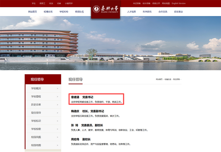 嘉興大學官方網站“現任領導”一欄日前更新顯示,章建通已任嘉興大學黨委書記,主持學校黨委全面工作。章建通此前擔任中共浙江省嘉興市委常委、市紀委書記。