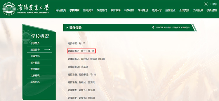 近日,沈陽農業大學官網“現任領導”欄目變更顯示,李斌已任沈陽農業大學黨委副書記、校長。公開報道顯示,沈陽農業大學上一任校長為陳啟軍,于2018年初上任,2024年初卸任。此后,沈陽農業大學校長職務空缺至今。