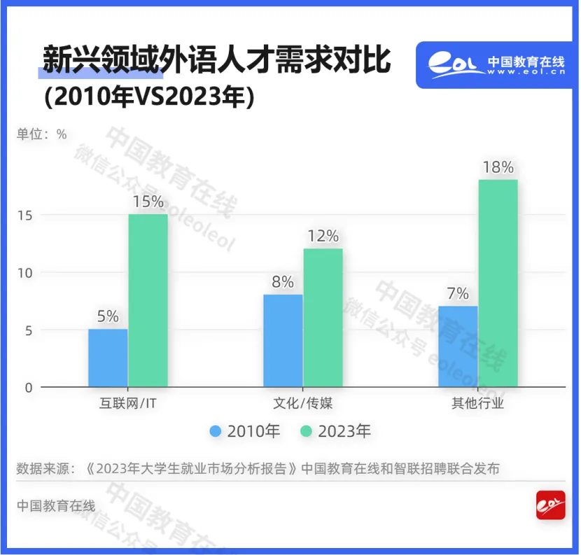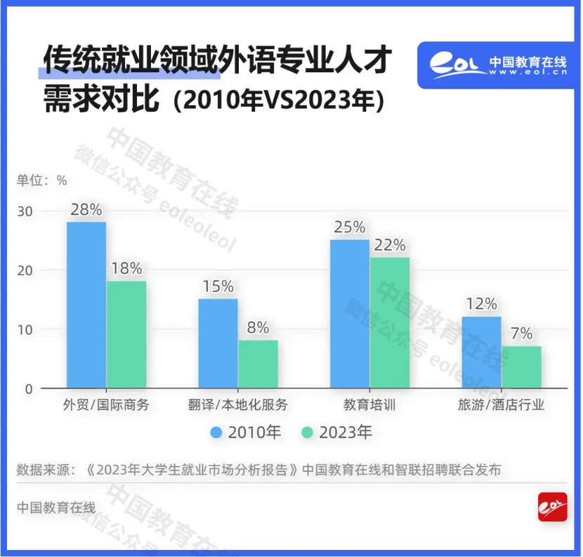 傳統就業領域急劇萎縮。外貿/國際商務領域就業占比從2010年的28%降至2023年的18%;翻譯/本地化服務領域從15%降至8%,幾乎腰斬;教育培訓領域從25%降至22%,K12英語培訓更是斷崖式下跌;旅游/酒店行業從12%降至7%。