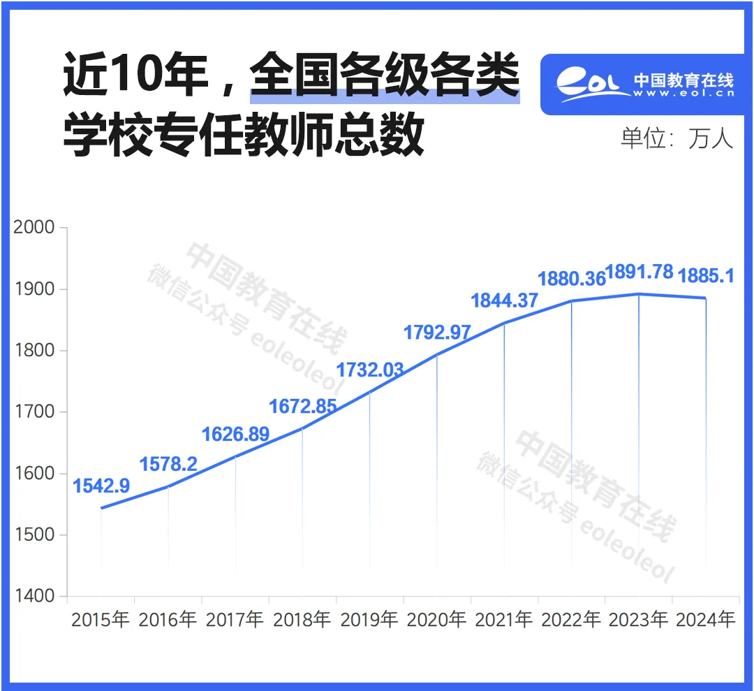 2024年,全國各級各類教師達1885.1萬人,比2019年增加150多萬人,比2015年增加340多萬人。