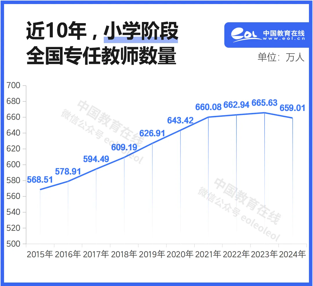 十年來,我國小學階段專任教師總數穩定上漲。從2015年的568.51萬,至2024年的659.01萬,增加了90多萬人。