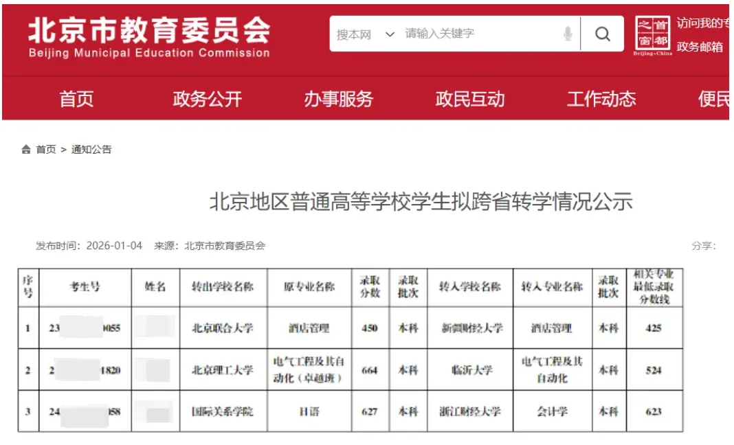 北京地區普通高等學校學生擬跨省轉學情況公示(圖源:北京市教委官網-2024年1月2日)
