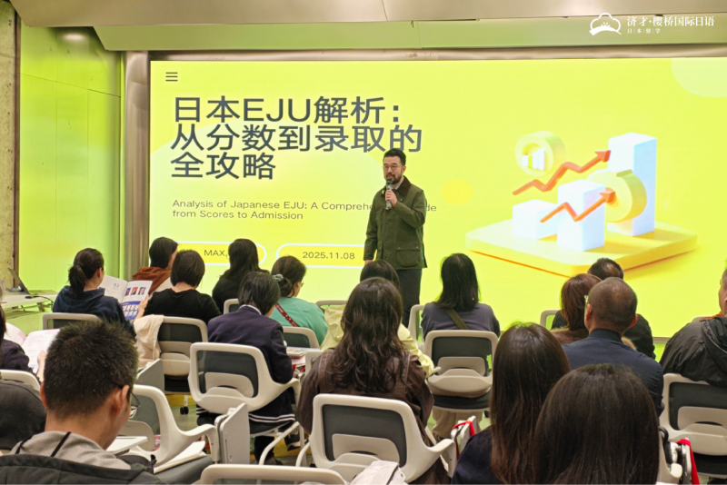 上午舉行的日本專場由兩位資深嘉賓進行主題分享。東京大學教育學研究科、慶應義塾大學碩士畢業的麥老師,為現場學員深度解讀日本各大學最新招生政策,系統解析了日本大學(學部)升學關鍵考試EJU及校內考流程,并結合官方數據與具體案例提出規劃建議。隨后,日本筑波大學畢業、日語教育行業從事12年的吳嬿老師圍繞日語學習方法進行講解,從學習節奏、備考策略及能力提升等方面提出實踐性建議。