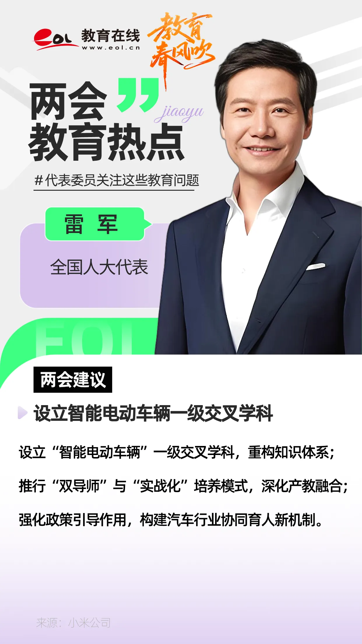 雷軍:建議設立“智能電動車輛”一級交叉學科