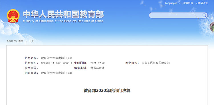 7月8日,教育部官方網站公布了教育部2020年度部門決算。決算文件顯示,教育部 2020 年度收入總計 48,443,630.19 萬元,支出總計 48,443,630.19 萬元。與 2019 年相比,收、支總計各增加1,175,582.76 萬元,增長 2.5%。