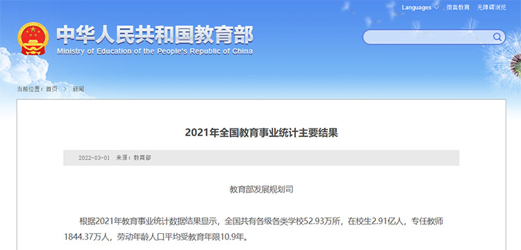 3月1日,教育部發布2021年全國教育事業統計主要結果。根據2021年教育事業統計數據結果顯示,全國共有各級各類學校52.93萬所,在校生2.91億人,專任教師1844.37萬人,勞動年齡人口平均受教育年限10.9年。