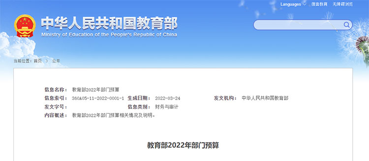 3月24日,教育部官方網站公布了教育部2022年部門預算。預算文件顯示,教育部2022年部門預算中一般公共預算當年財政撥款為 13,794,401.91 萬元,比 2021年執行數增加 122,413.70 萬元。
