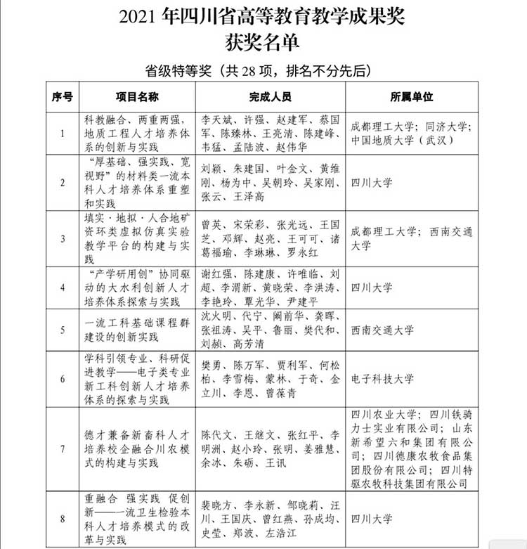 2021年四川省教學成果獎公布,特等獎有60項