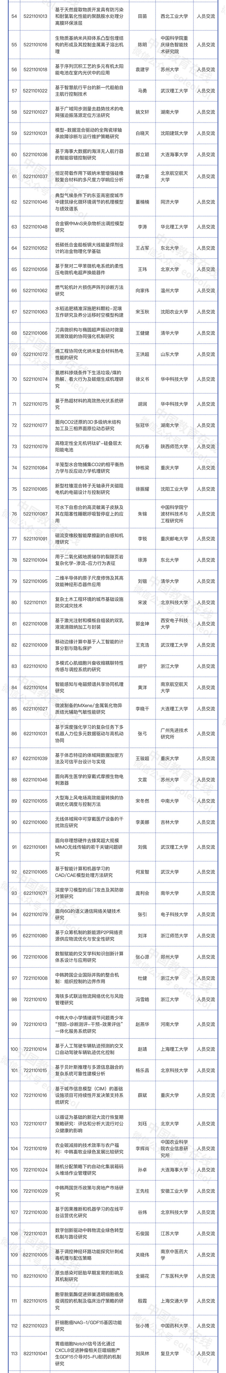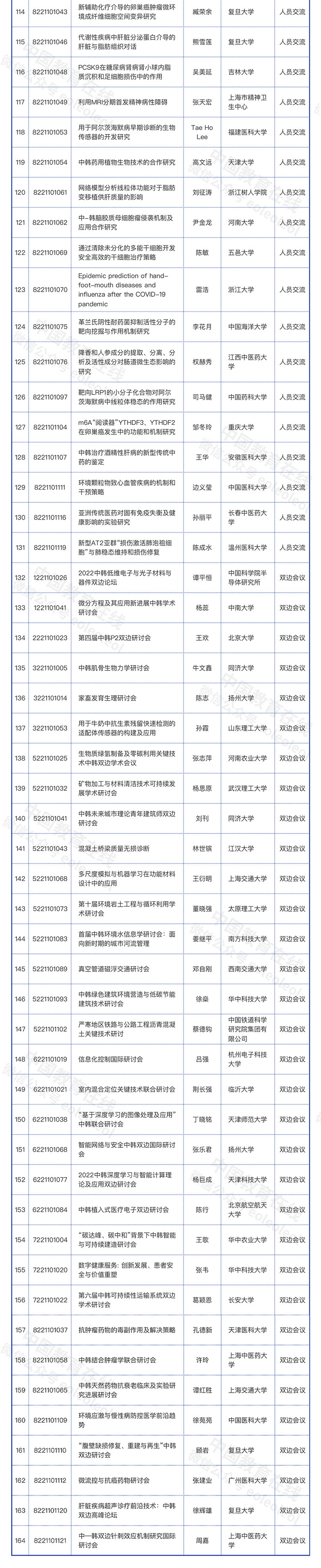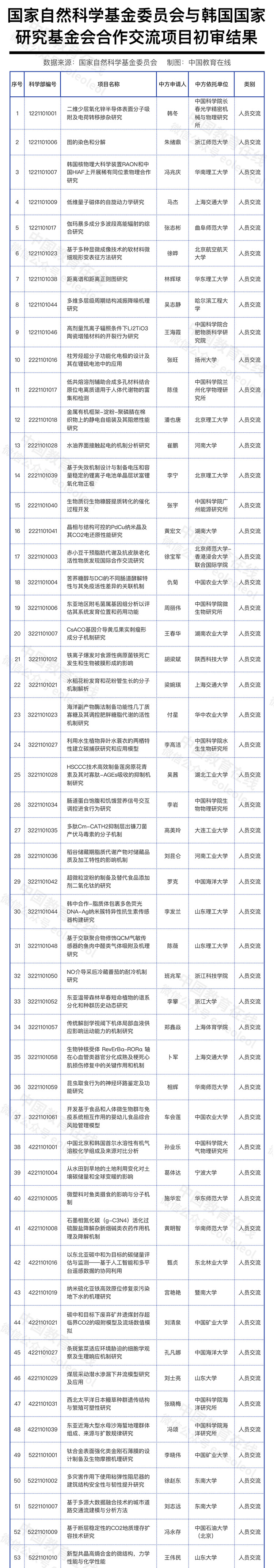 4月21日,國家自然科學基金委員會與韓國國家研究基金會合作交流項目初審結果公布,共164項項目通過初審,上海交通大學、浙江大學、復旦大學、武漢理工大學、華中科技大學、重慶大學等89所高校的147個項目入選。