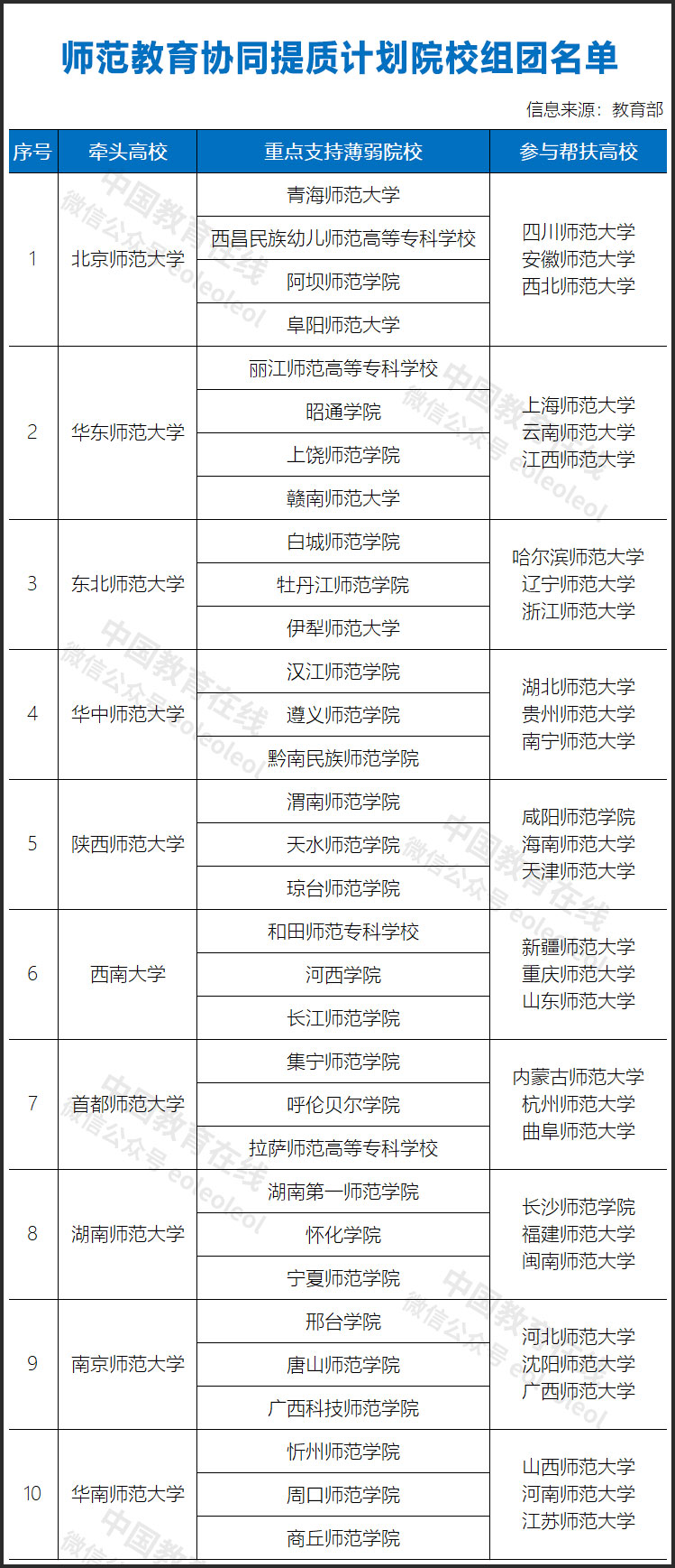 經各省教育廳推薦,教育部通過前期調研、形式審查、專家評議等環節,最終確定由北京師范大學、華東師范大學、東北師范大學、華中師范大學、陜西師范大學、西南大學、首都師范大學、湖南師范大學、南京師范大學、華南師范大學等10所“雙一流”師范大學牽頭,四川師范大學、安徽師范大學、西北師范大學等30所高水平師范院校參與,支持幫扶青海師范大學、西昌民族幼兒師范高等專科學校、阿壩師范學院等32所地方薄弱師范院校。