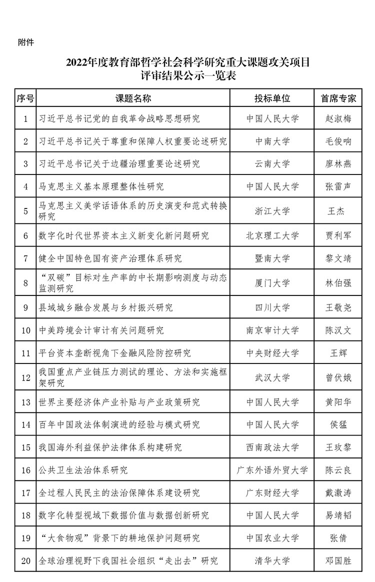2022年度教育部哲學社會科學研究重大課題攻關項目按照《教育部哲學社會科學研究重大課題攻關項目管理辦法》相關規定,經組織專家評審,共有51個課題通過評審。現將評審結果面向社會公示,公示期為:2022年12月13日-12月19日。