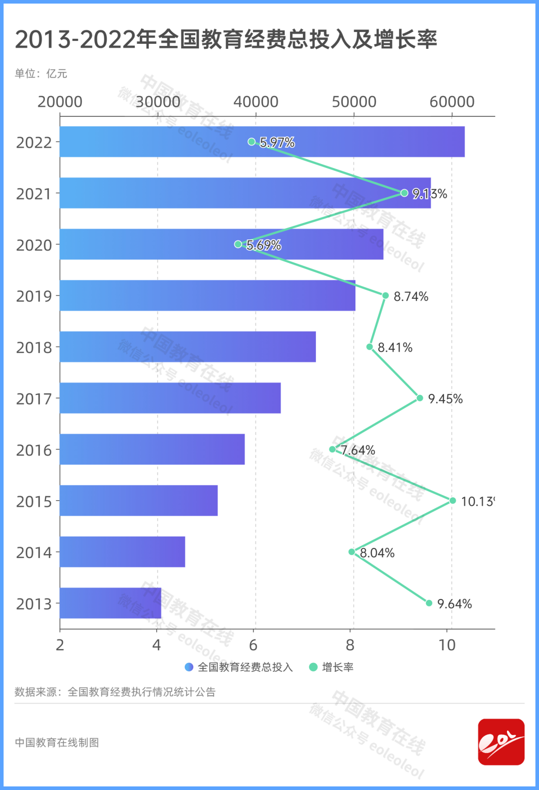 2023年12月,教育部、國家統計局、財政部發布《2022年全國教育經費執行情況統計公告》,公告顯示:全國教育經費總投入為61329.14億元,首次超過6萬億元,比上年增長5.97%。