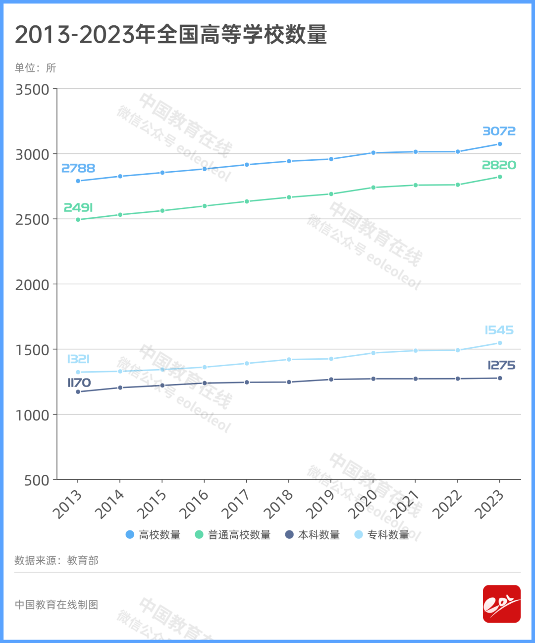 據教育部網站,截至2023年6月15日,全國高等學校共計3072所,其中:普通高等學校2820所,含本科院校1275所、高職(專科)院校1545所;成人高等學校252所。