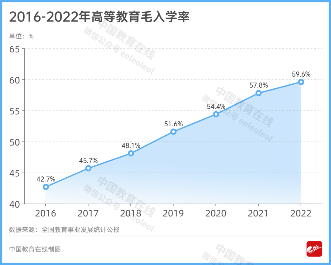 2023年3月,教育部發布《2022年全國教育事業發展統計公報》。公報顯示,2022年高等教育毛入學率59.6%,比上年提高1.8個百分點。