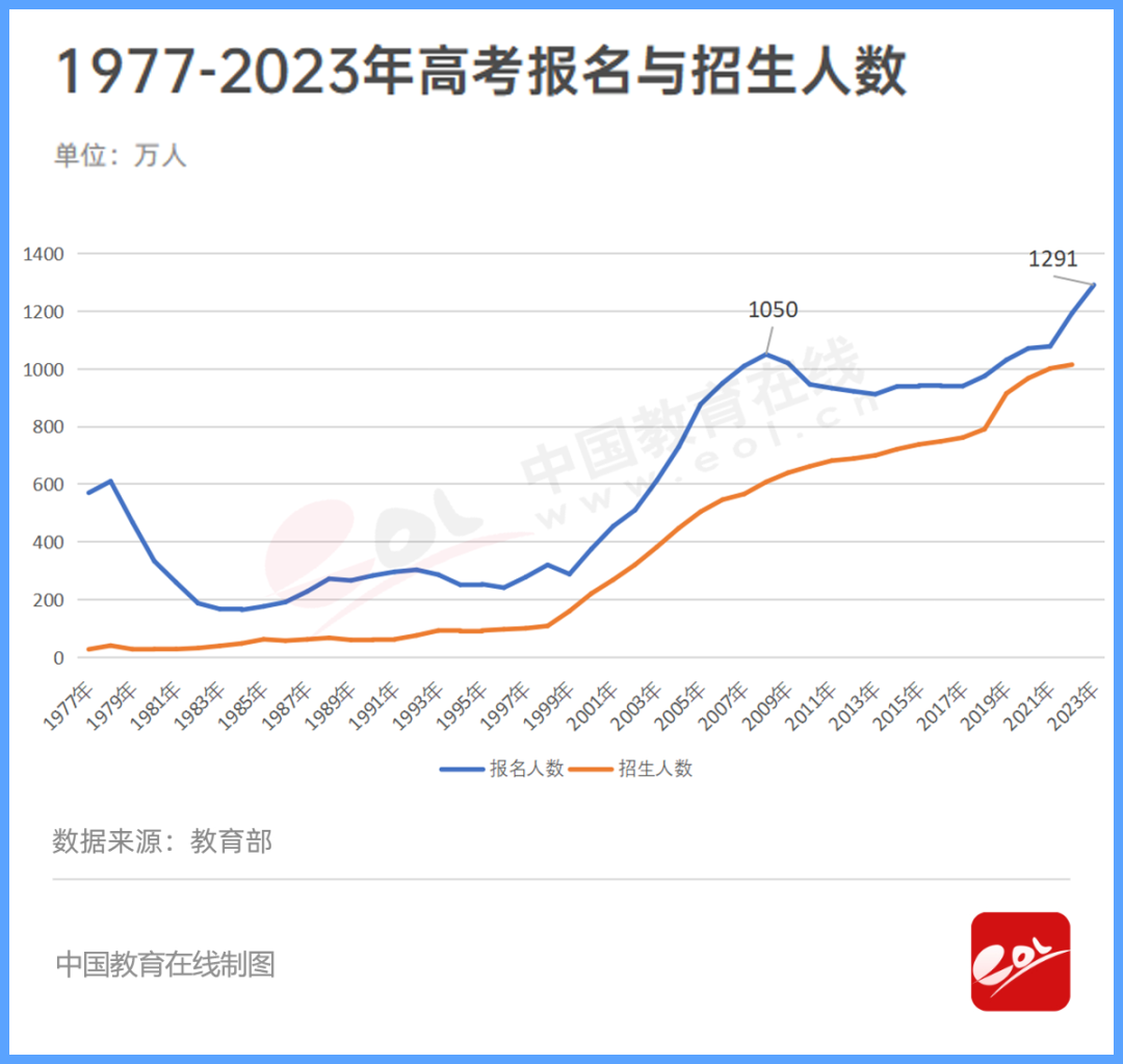 6月,教育部公布2023年全國高考報名人數為1291萬人,較去年增加98萬人,再創歷史新高。