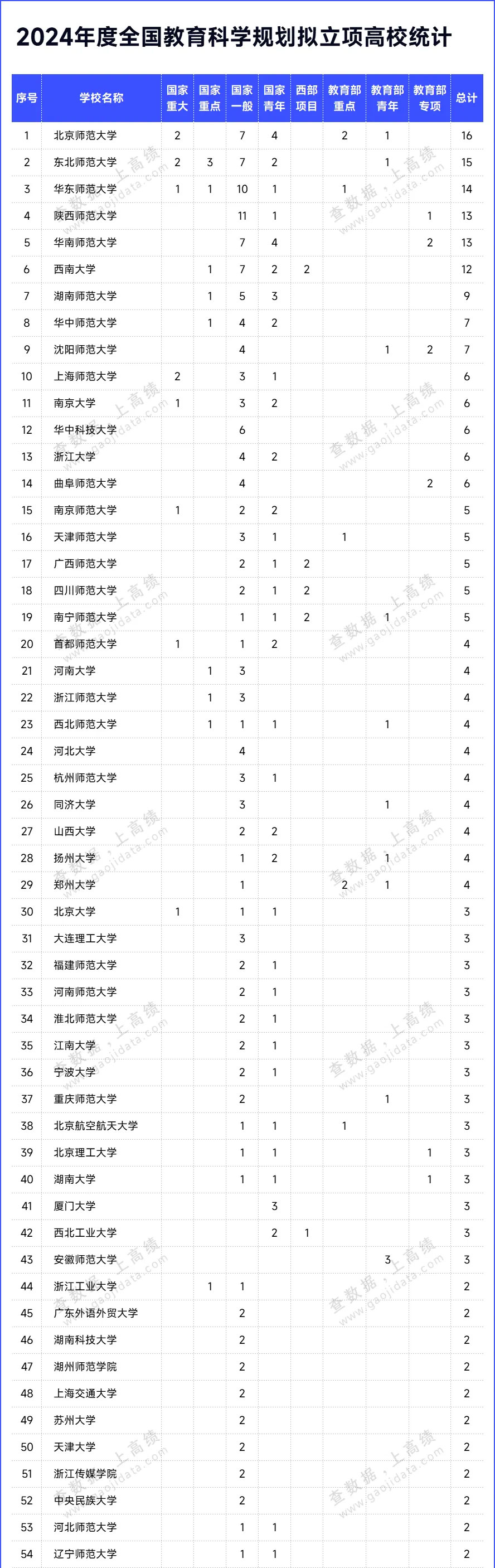 據統計,此次全國教育科學規劃2024年度課題擬立項名單中,高校共407項課題擬獲立項資助。擬立項課題最多的是北京師范大學,擬立項16個課題。其次是東北師范大學和華東師范大學,分別擬立項15個和14個課題。