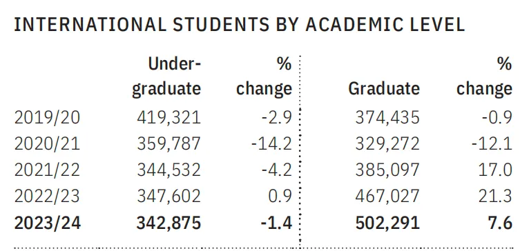 在學術層次方面,本科留學生人數為342,875人,略有下降;而研究生人數則達到502,291人,同比增長7.6%,顯示出越來越多國際學生傾向于赴美攻讀研究生學位。