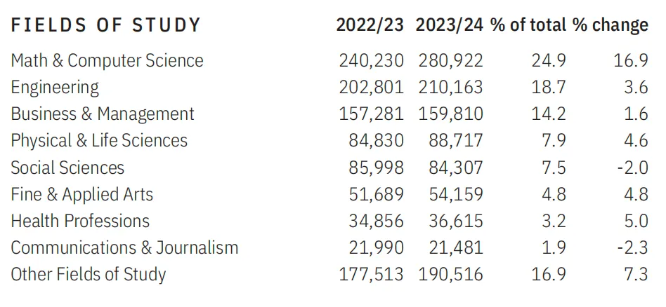 在專業選擇方面,數學與計算機科學專業依舊是國際學生的首選,共有280,922人就讀,其次是工程類專業,共計210,163人。商業與管理專業也廣受歡迎,就讀人數達到159,810人。STEM領域的留學熱度持續升溫,占據了整體國際學生群體中的半壁江山。