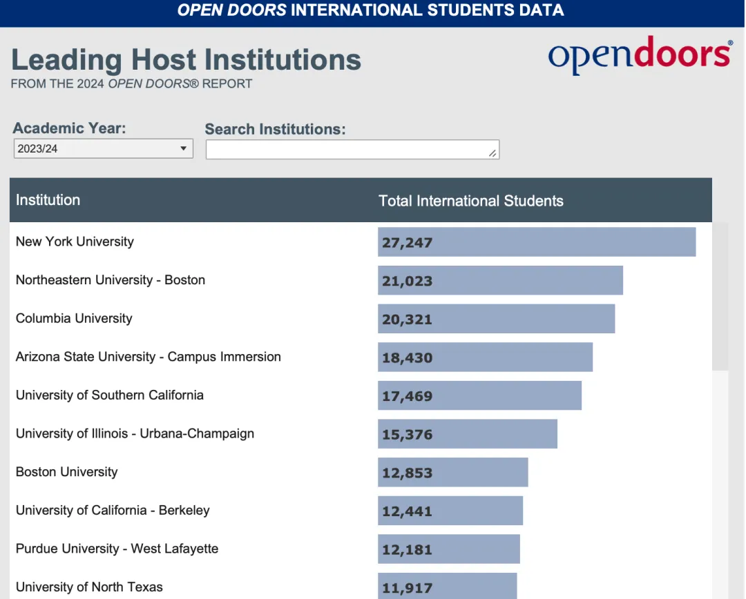 紐約大學以27,247名國際學生繼續穩居榜首,成為最受歡迎的院校。緊隨其后的是東北大學波士頓校區、哥倫比亞大學、亞利桑那州立大學和南加州大學等。