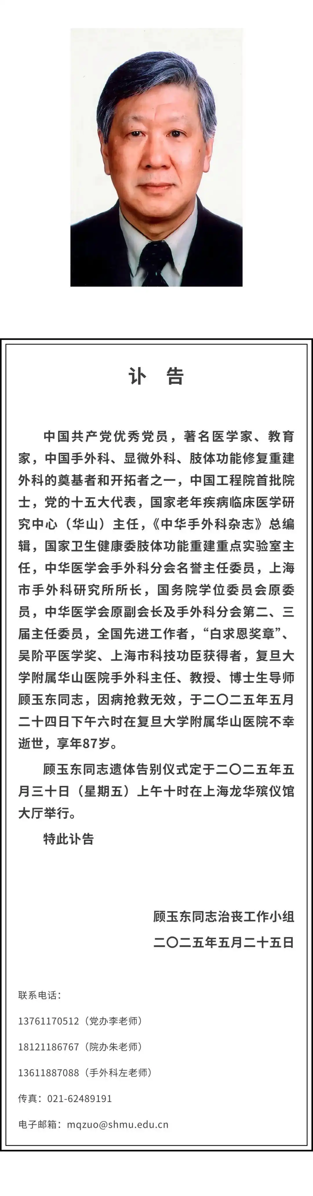 5月25日,復旦大學附屬華山醫院發布訃告。2025年5月24日下午6時,中國工程院首批院士、復旦大學附屬華山醫院手外科主任顧玉東同志,因病搶救無效,在上海不幸逝世,享年87歲。