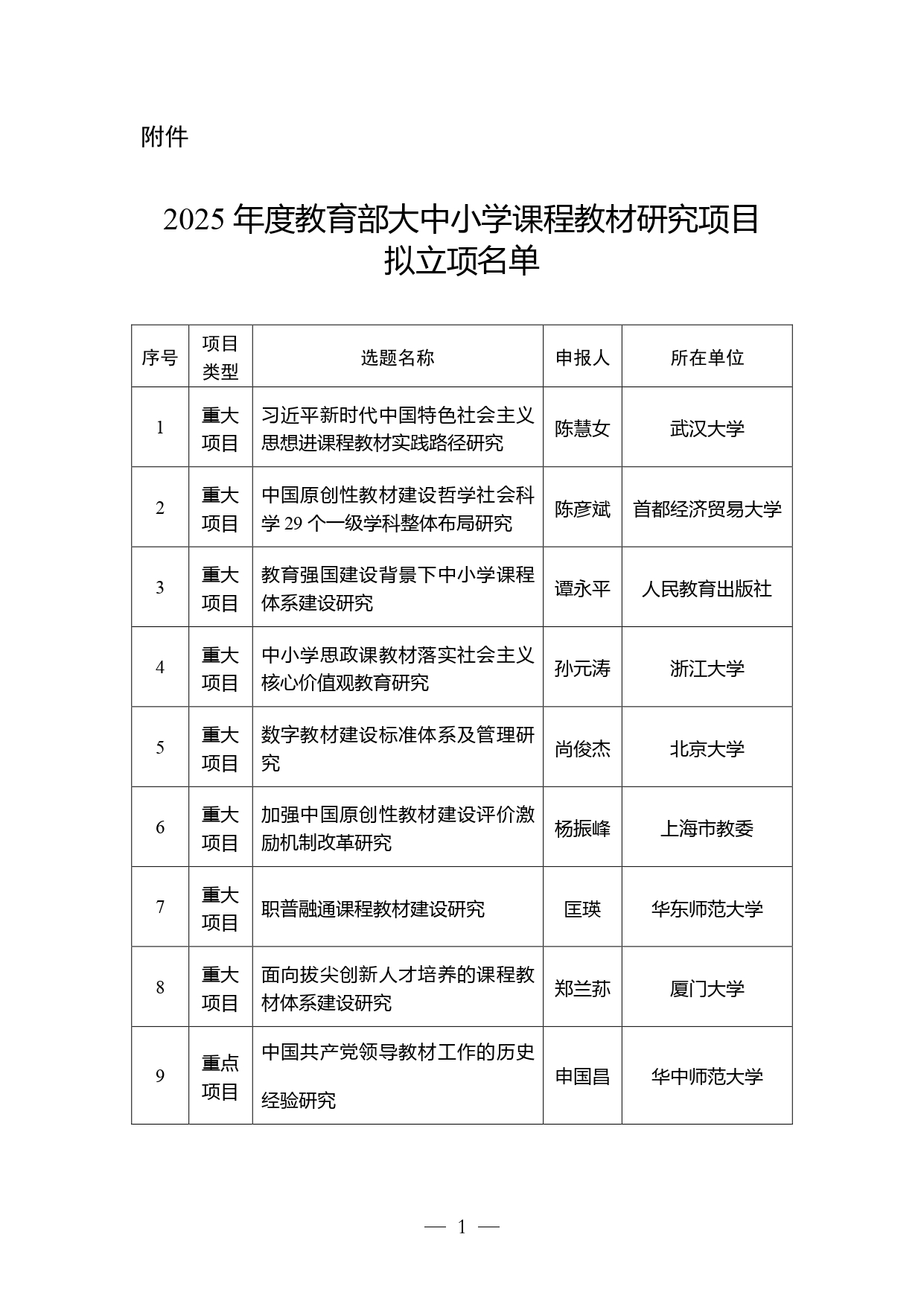 教育部公示2025年度大中小學課程教材研究項目擬立項名單