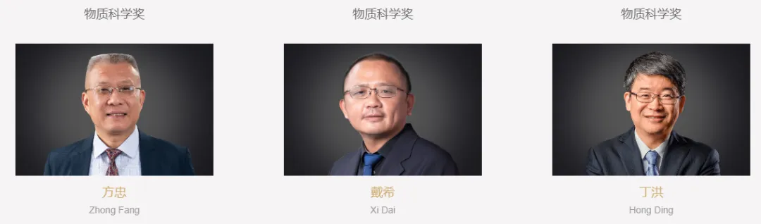 “物質科學獎”獲獎者方忠、戴希、丁洪,表彰他們在拓撲電子材料的計算預測以及實驗實現方面做出的貢獻。