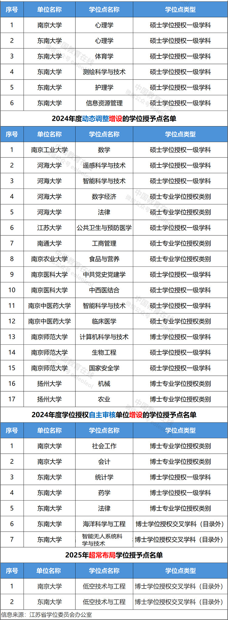 近日,江蘇省學位委員會辦公室公開《江蘇省學位委員會辦公室發布關于下達2024年度學位授權自主審核單位撤銷和增設的學位授予點名單的通知》《江蘇省學位委員會辦公室關于下達2025年超常布局學位授予點名單的通知》《江蘇省學位委員會辦公室關于下達2024年度動態調整撤銷和增設的學位授予點名單的通知》。