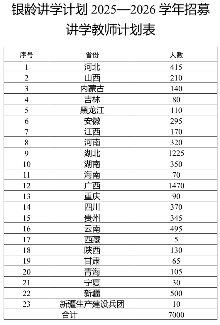 (二)招募人數。2025年義務教育階段計劃招募7000名講學教師(見附件)。在此基礎上,鼓勵各省份和兵團結合實際,面向其他比較薄弱縣鄉地區和教育發展欠發達區域自主選拔優秀退休教師開展講學,可酌情將普通高中納入實施范圍。