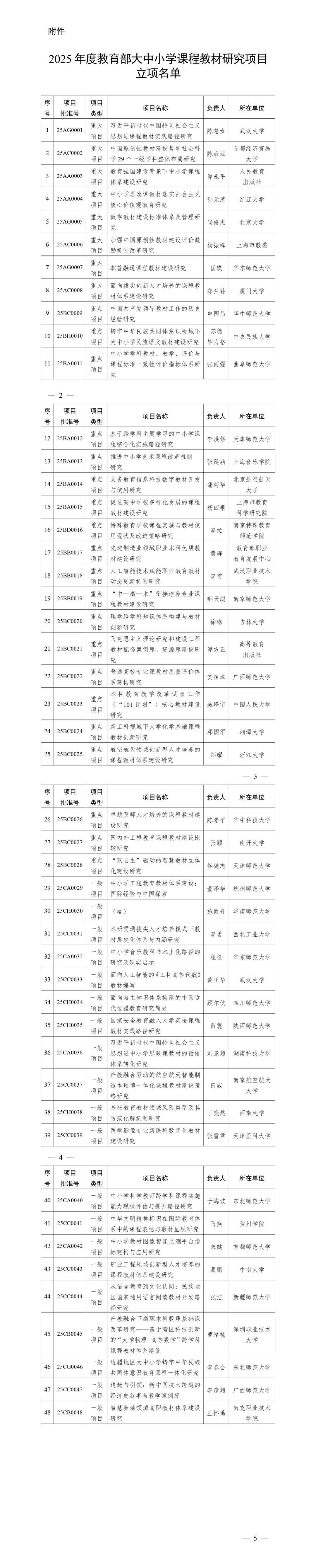 根據《教育部大中小學課程教材研究項目管理辦法》(教材廳〔2025〕1號)和《教育部辦公廳關于組織申報2025年度教育部大中小學課程教材研究項目的通知》(教材廳函〔2025〕7號),經組織申報、專家嚴格評審并面向社會公示,2025年度教育部大中小學課程教材研究項目共立項48項,現予以公布。各立項項目具體要求及安排由項目辦公室另行通知。