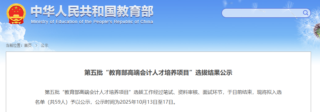 10月13日,教育部財務司發布第五批“教育部高端會計人才培養項目”選拔結果的公示。