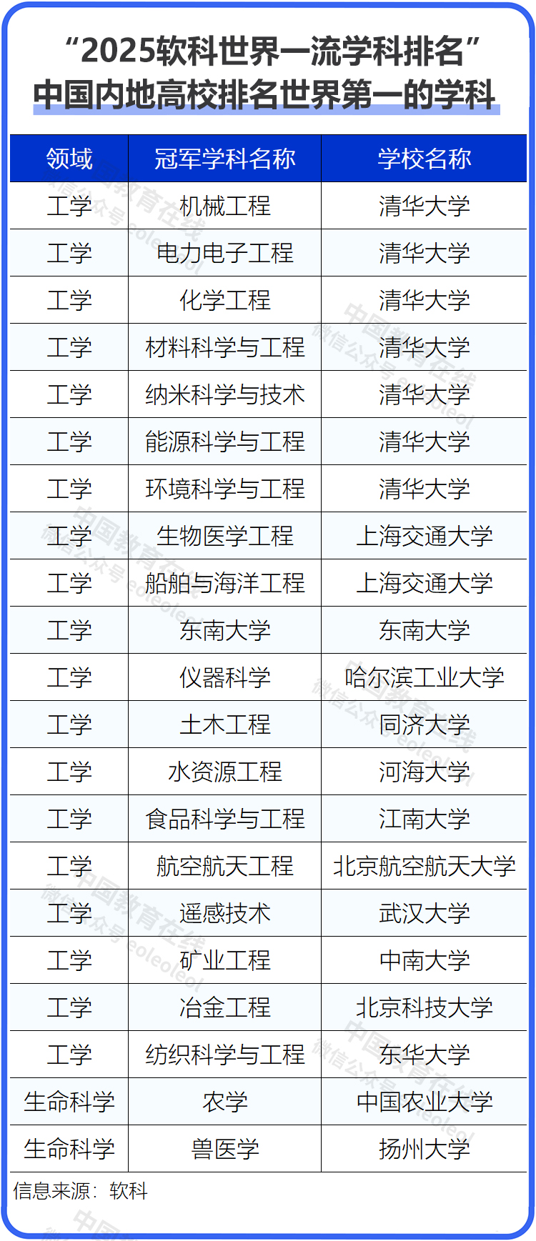 2025軟科世界一流學科排名中,中國內地高校在電力電子工程、生物醫學工程、材料科學與工程3個學科首度問鼎世界第一,使得中國內地高校的全球冠軍學科增加到21個。分別是清華大學(機械工程、電力電子工程、化學工程、材料科學與工程、納米科學與技術、能源科學與工程、環境科學與工程)、上海交通大學(生物醫學工程、船舶與海洋工程)、東南大學(通信工程)、哈爾濱工業大學(儀器科學)、同濟大學(土木工程)、河海大學(水資源工程)、江南大學(食品科學與工程)、北京航空航天大學(航空航天工程)、武漢大學(遙感技術)、中南大學(礦業工程)、北京科技大學(冶金工程)、東華大學(紡織科學與工程)、中國農業大學(農學)、揚州大學(獸醫學)。其中,揚州大學首次擁有全球冠軍學科。