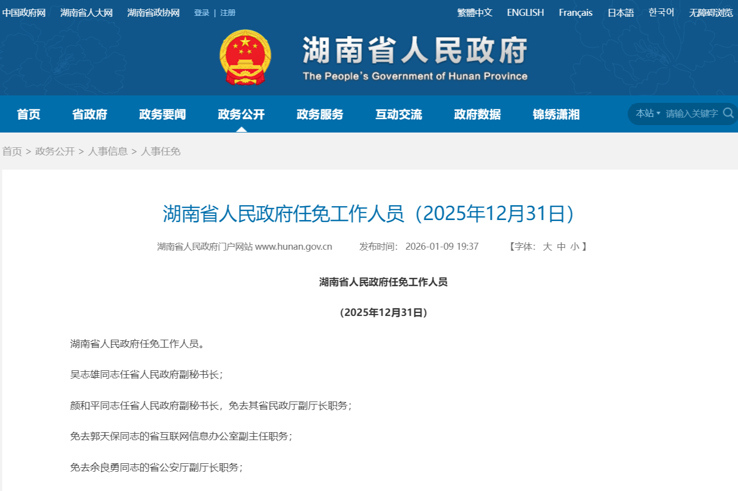 湖南省人民政府網站1月9日發布消息,2025年12月31日,湖南省人民政府任免工作人員,涉及多所高校。