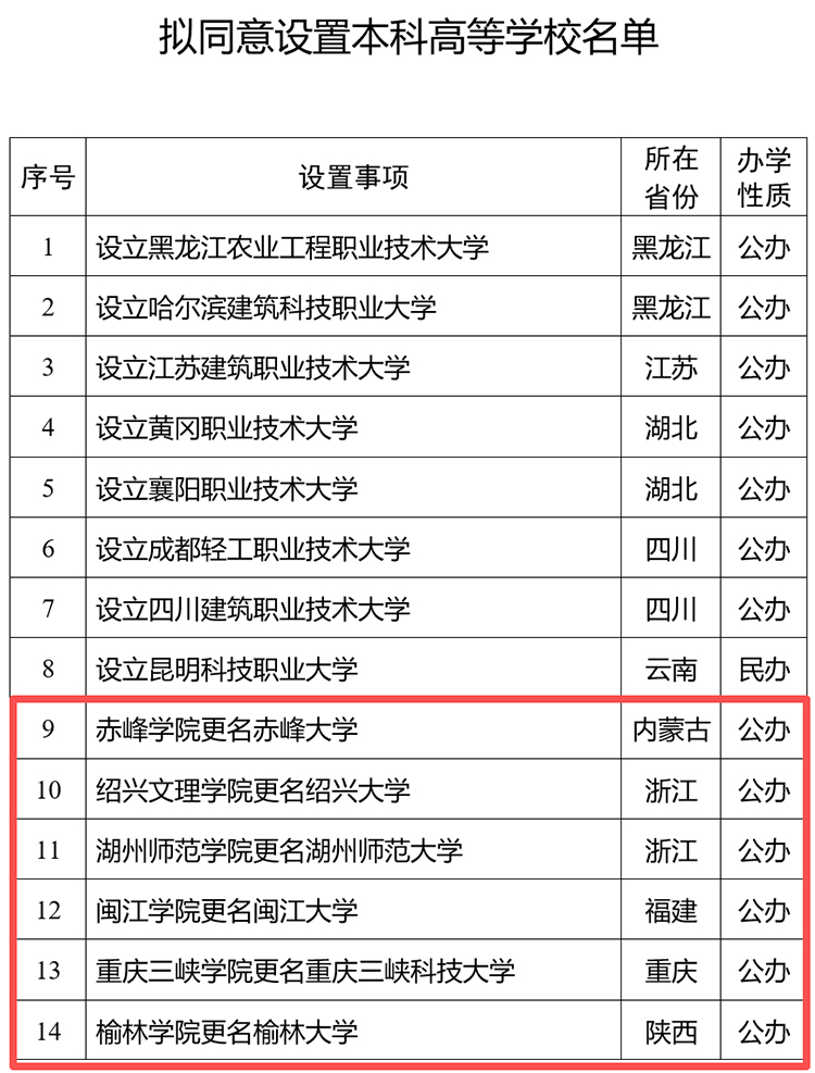 1月12日,教育部發布《關于擬同意設置本科高等學校的公示》。根據有關規定,經教育部黨組會議審議,擬同意設置黑龍江農業工程職業技術大學等14所學校,其中,赤峰學院、紹興文理學院、湖州師范學院、閩江學院、重慶三峽學院、榆林學院等6所高校更名大學。