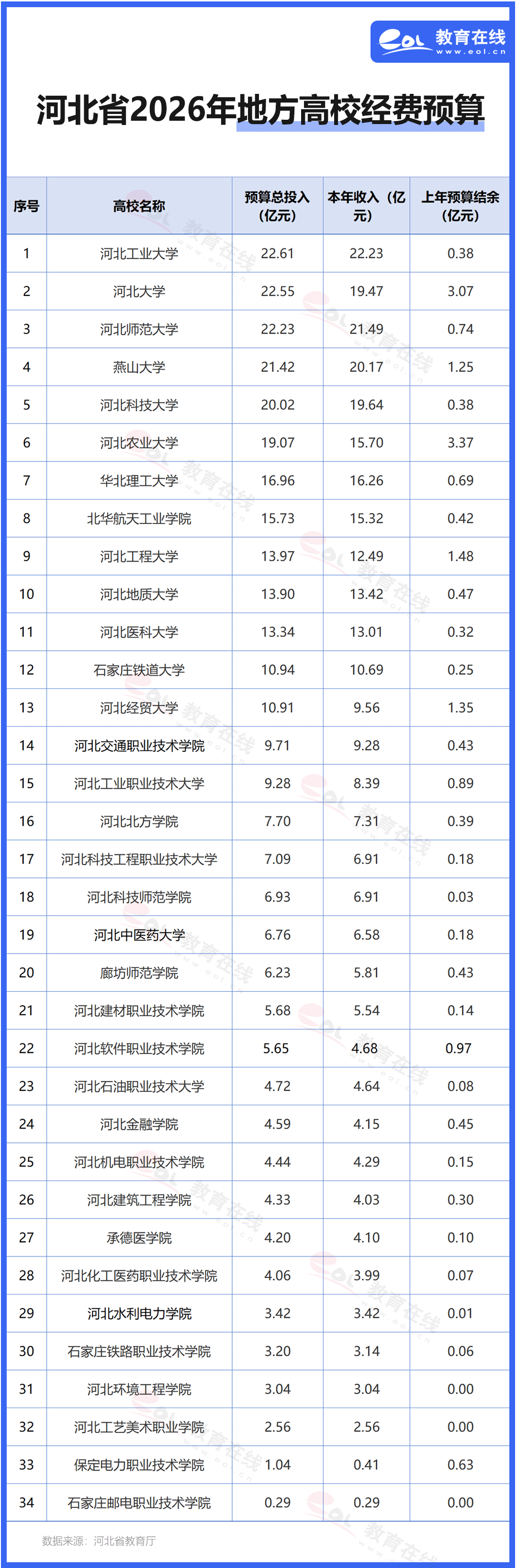 近日,河北省教育廳公布了2026年所屬單位預算信息,其中包含了34所高校。