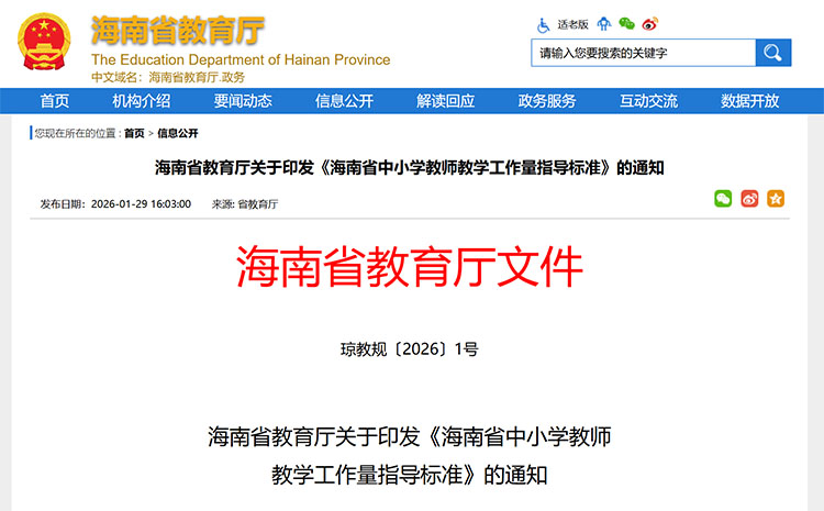 (五)本指導標準自2026年3月1日起執行。有效期5年。此前發布的相關規范性文件中,與本文件規定不一致的內容,以本文件為準。《海南省教育廳關于印發〈海南省普通中小學教師工作量指導標準(試行)〉與〈海南省普通中小學校教師配備指導比例(試行)〉的通知》(瓊教師〔2015〕11號)廢止。