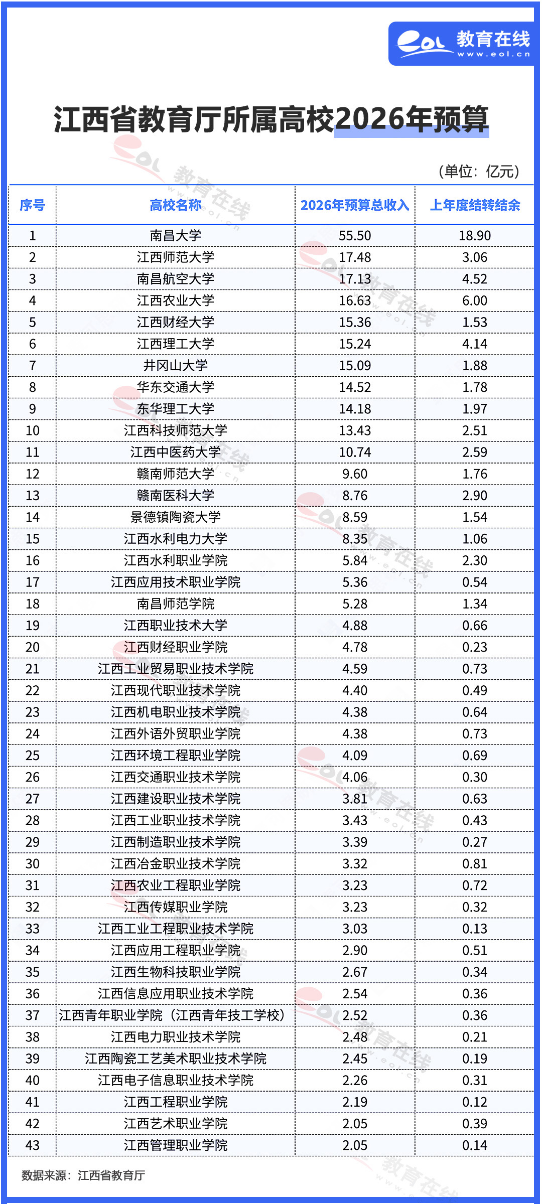 近日,江西省教育廳公布了2026年所屬單位預算信息,其中包含了43所高校。