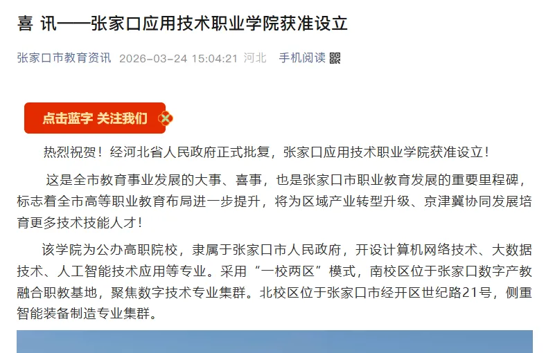 據張家口市教育局官方微信公眾號3月24日消息,經河北省人民政府正式批復,張家口應用技術職業學院獲準設立。