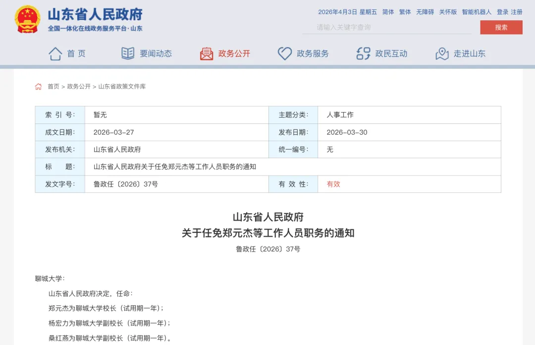 近日,山東省人民政府發布最新人事任免,其中涉及聊城大學、山東農業工程學院、臨沂職業學院、山東交通學院、山東管理學院、聊城科技職業學院等多所高校領導班子調整。