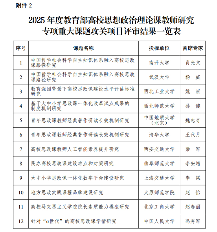 4月2日,教育部社會科學司公示2025年度教育部哲學社會科學研究重大課題攻關項目、高校思想政治理論課教師研究專項重大課題攻關項目評審結果。