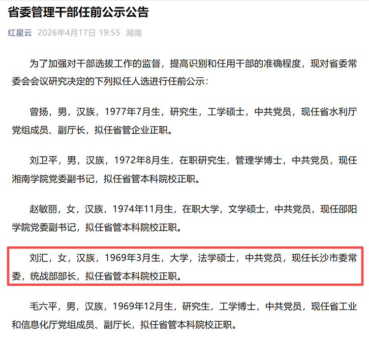 4月17日,中共湖南省委組織部發布《省委管理干部任前公示公告》。其中提到:劉匯,女,漢族,1969年3月生,大學,法學碩士,中共黨員,現任長沙市委常委,統戰部部長,擬任省管本科院校正職。
