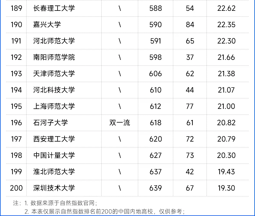 最新自然指數排名中國內地高校Top200名單如下: