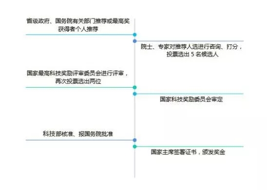 其次,國家最高科學技術獎的產生需經過非常嚴格規范的審批流程,除具備推薦資格的單位或個人推薦以外,還需經過院士、專家咨詢打分、國家最高科技獎勵評審委員會評審、國家科技獎勵委員審定、科技部審核、國務院批準等流程。